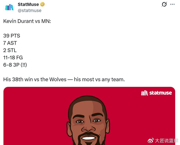 凭借这样的表现,杜兰特生涯至今已经38次击败森林狼,创造其生涯击败球队次数新高。