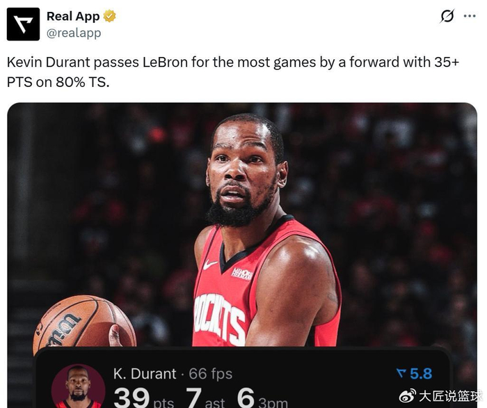 并且这是杜兰特生涯第21次单场至少轰下35分且真实命中率80%+,成功超越詹姆斯(20次)独占NBA锋线历史第一。